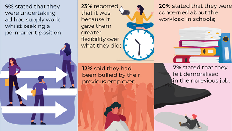 Seventeen per cent of supply teachers reported that they had to travel further than in previous years in order to secure work.