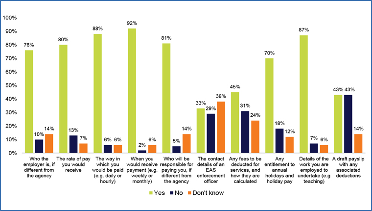 Seventeen per cent stated that they were not provided with the details of any designated contact(s) for any questions, problems or emergencies and just over one in ten (11%) reported that they were not given the details of who and where to report to each day, including details of the signing-in process.