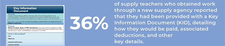 Despite it being a legal requirement since April 2020, just over a third of supply teachers (36%) who obtained work through a new supply agency reported that they had been provided with a Key Information Document (KID), detailing how they would be paid, associated deductions and other key details. A further two fifths (40%) stated that they did not know whether or not they had been provided with a KID by the agency.