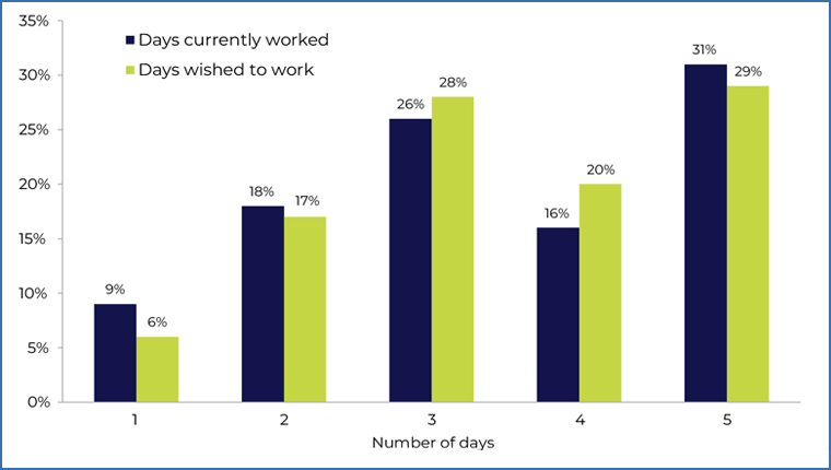 When supply teachers were asked how many days on average they were able to obtain work during the academic year 2023/24, almost one in ten (9%) said they obtained work one day a week, just under one fifth (18%) two days a week, and just over a quarter (26%) three days a week. Sixteen per cent of supply teachers in the survey said they were able to obtain work four days a week and 31% stated that they were able to obtain work five days a week. However, just over three quarters (77%) said that they wanted to work between three to five days a week.