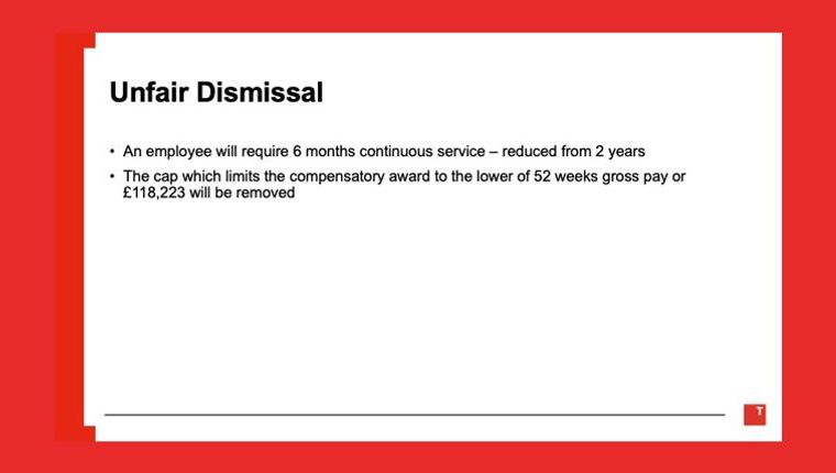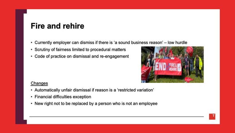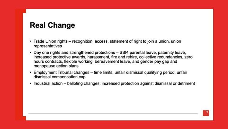 The reforms include trade union rights, collective redundancy, fire and rehire, collective bargaining, zero hours contracts, family friendly rights, flexible working, enhanced protections against harassment, the introduction of the Fair Work Agency, a day-one right to statutory sick pay, amended unfair dismissal rights, and extended time limits for employment tribunals.