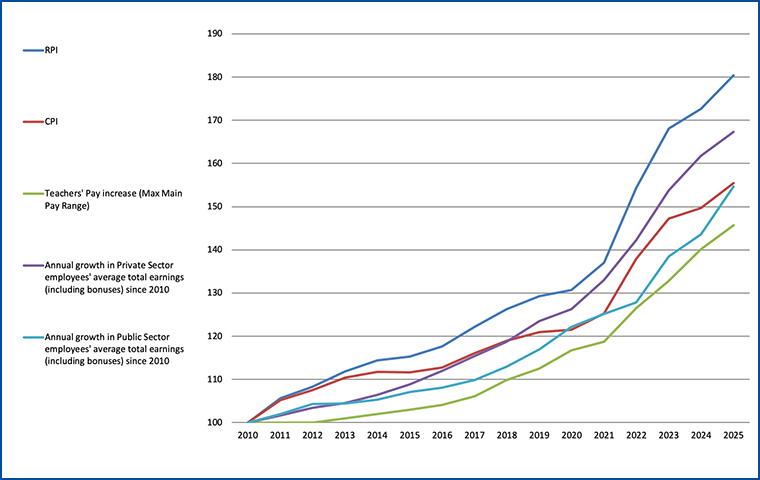 - The ‘real-terms pay cut’ figure is the difference between what a teacher will earn in 2025/26 and the amount that they would have earned in 2025/26 if the salary point on which they are paid had increased to match RPI inflation since 2010.